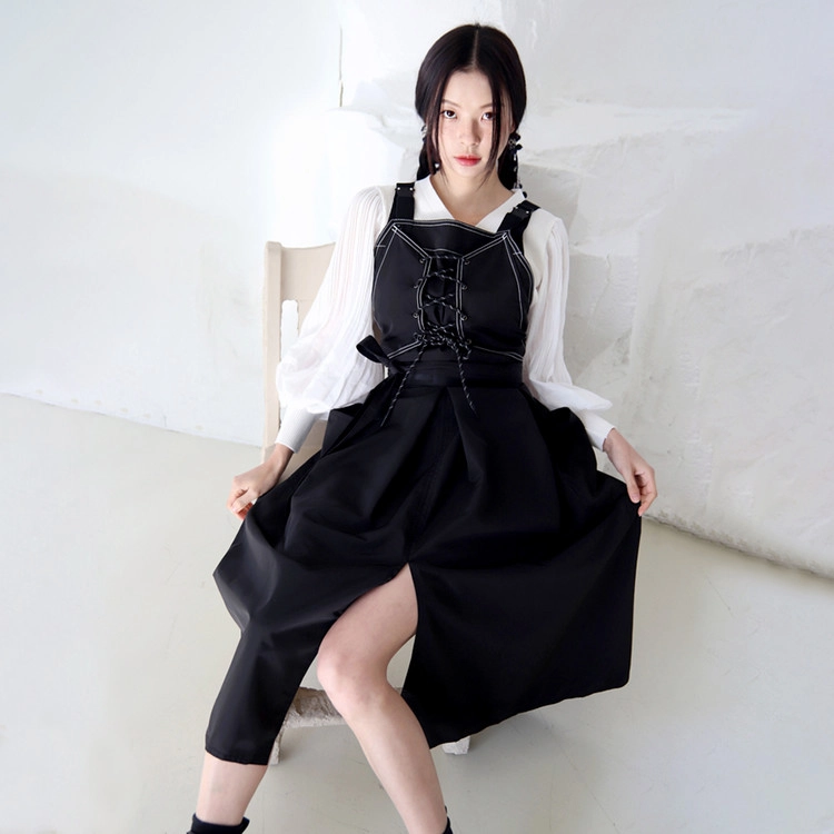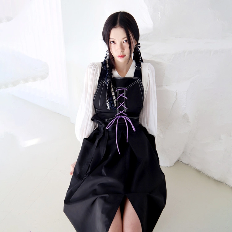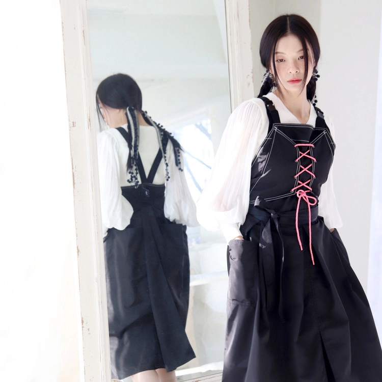 “베스트를 레이어드한 듯, 블랙 위에 배색되는 비비드한 아일렛 끈.”